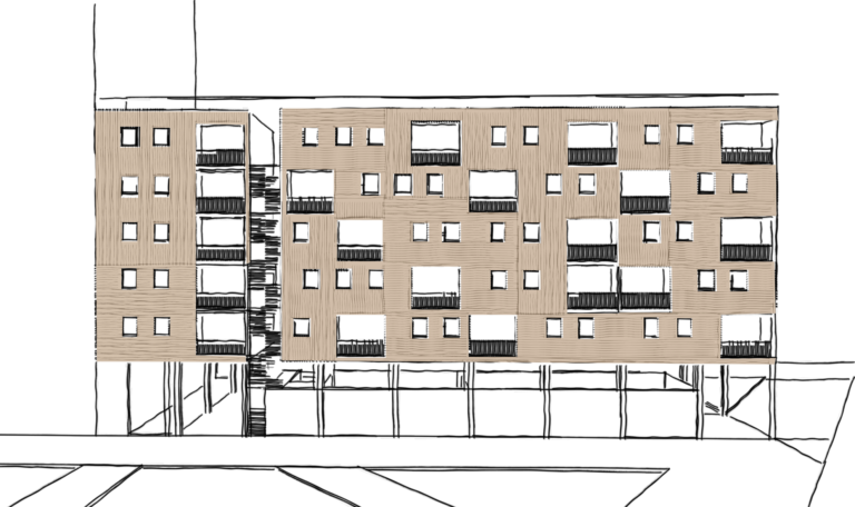 Para esta promoción de 41 viviendas sociales se dio prioridad a dejar la planta baja libre. Para que eso fuera posible se habilitó un piso en duplex encajado entre viviendas que pasaron de 3 a 2 habitaciones.